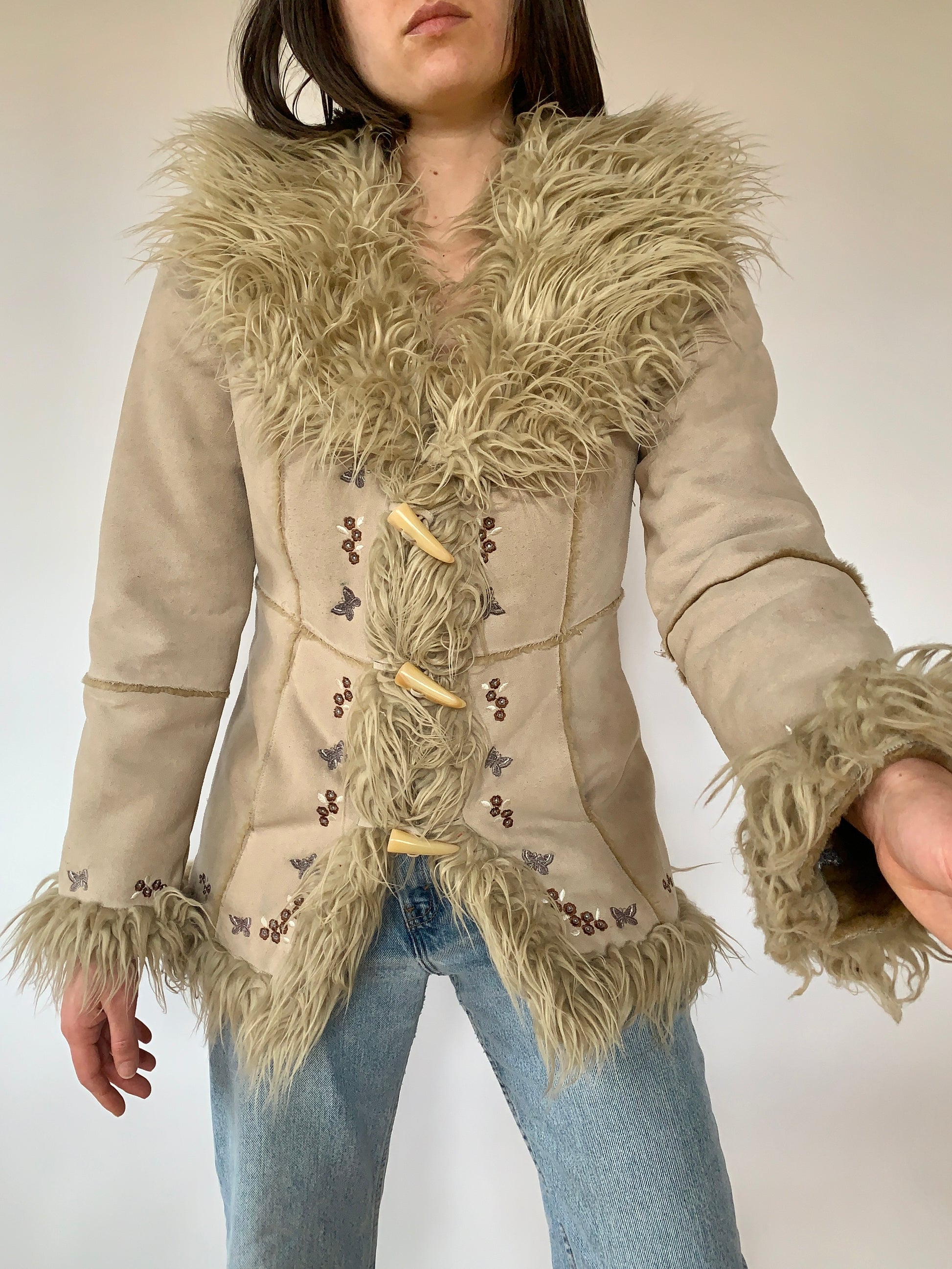Y2K penny lane jacket, made by Finesse USA. In a tan, faux suede & faux fur polyester material. With embroidered butterfly detail. Great condition. Tagged size small.