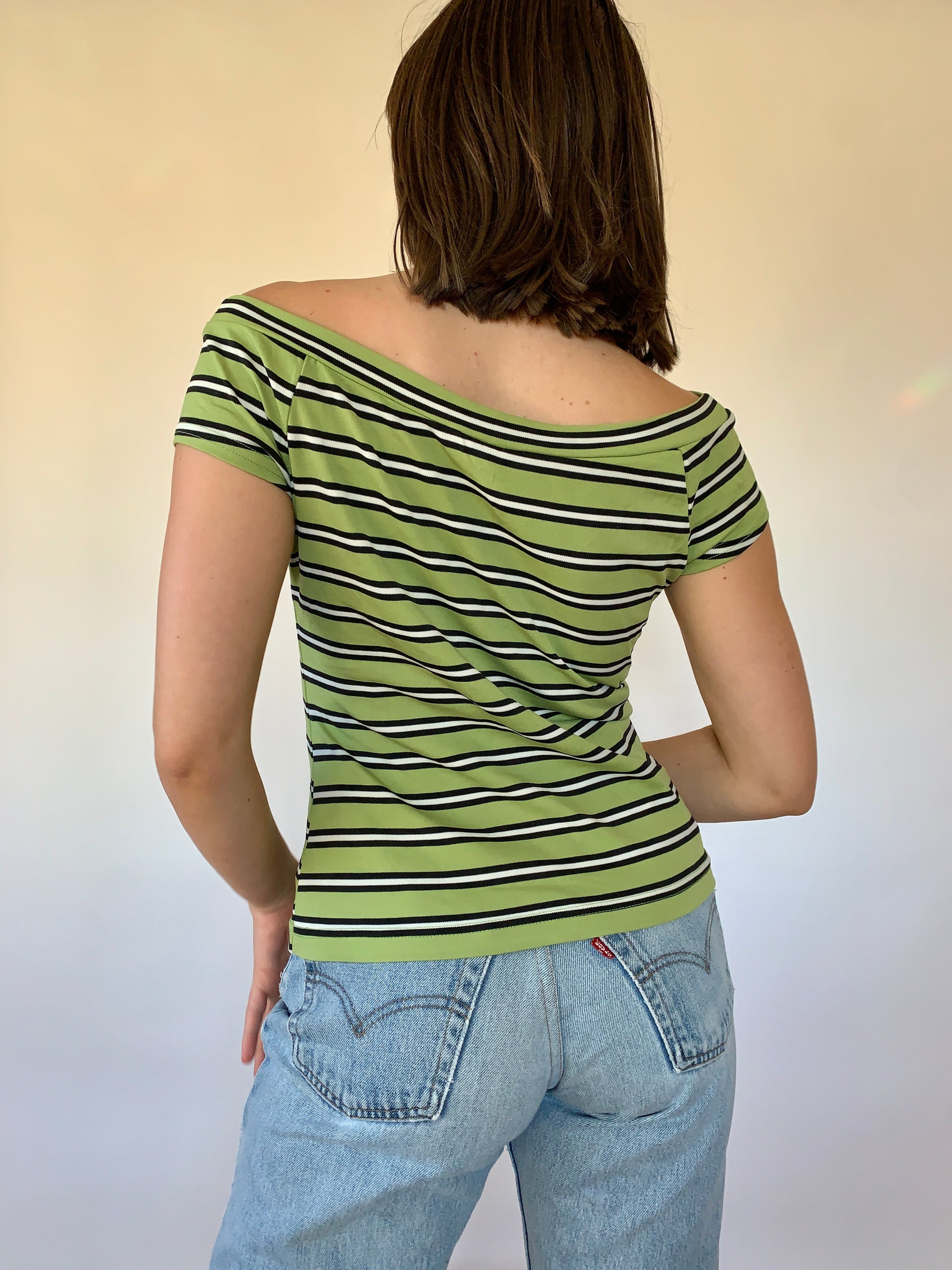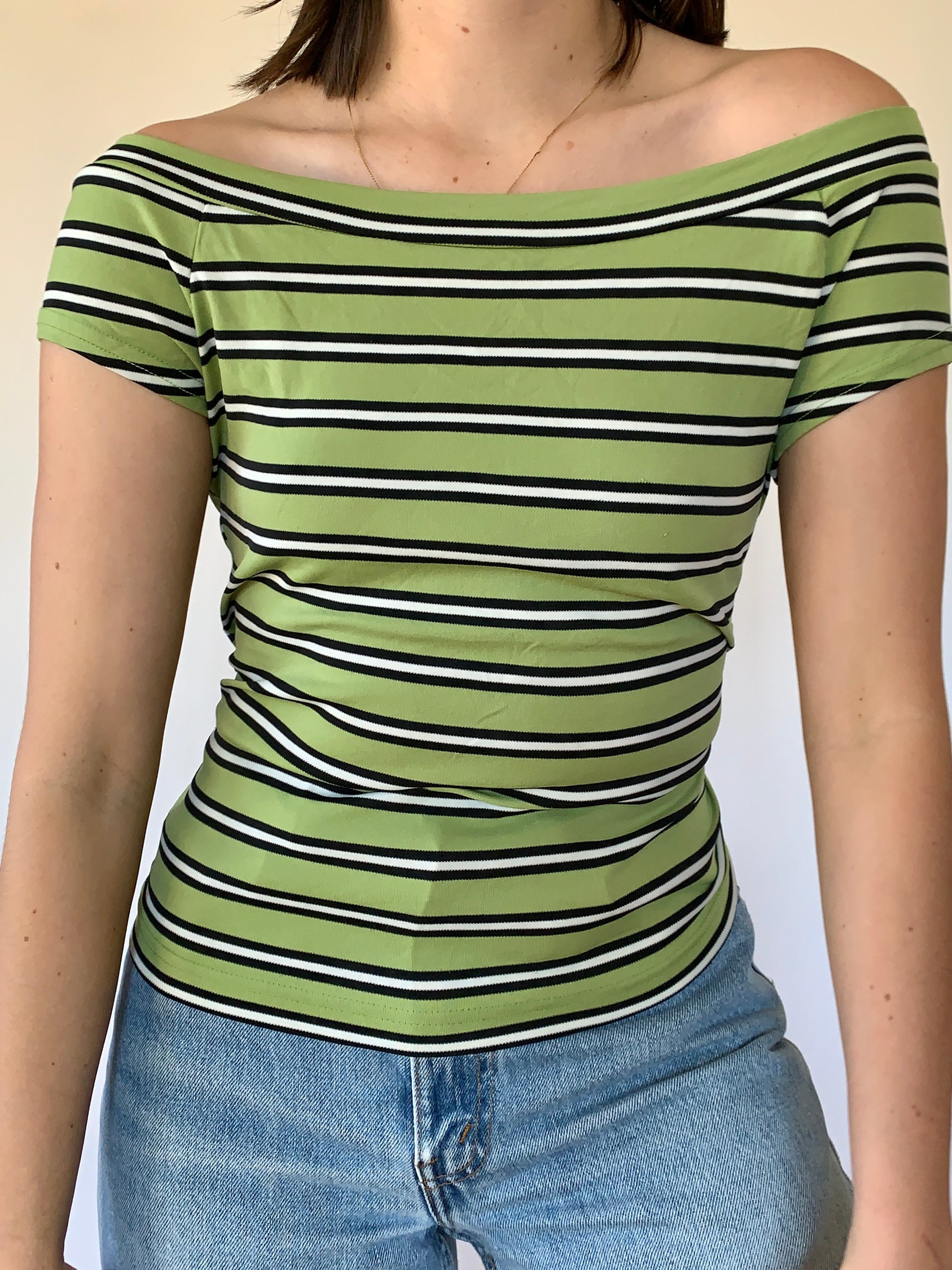 Y2K Self Esteem top. Boat neck style with green, black and white stripes. Material is a stretchy polyester & nylon blend. Good condition. Best fits size M, shown on size S.
