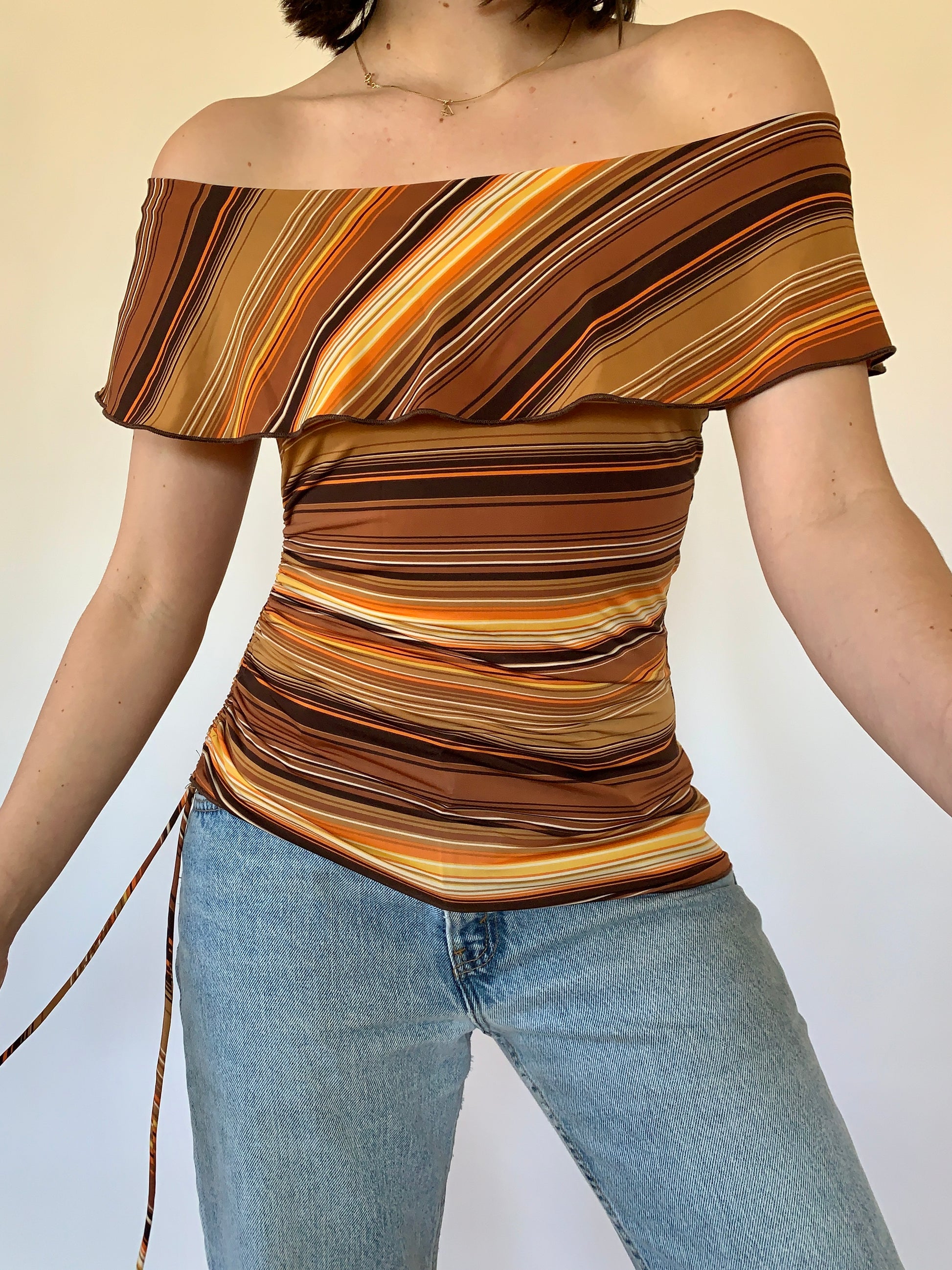 Y2K sunset top, made by XY Shop. Striped pattern in orange, brown, and yellow. Material is a poly spandex blend with stretch. Made in USA. Excellent condition. Tagged size L but runs smaller.
