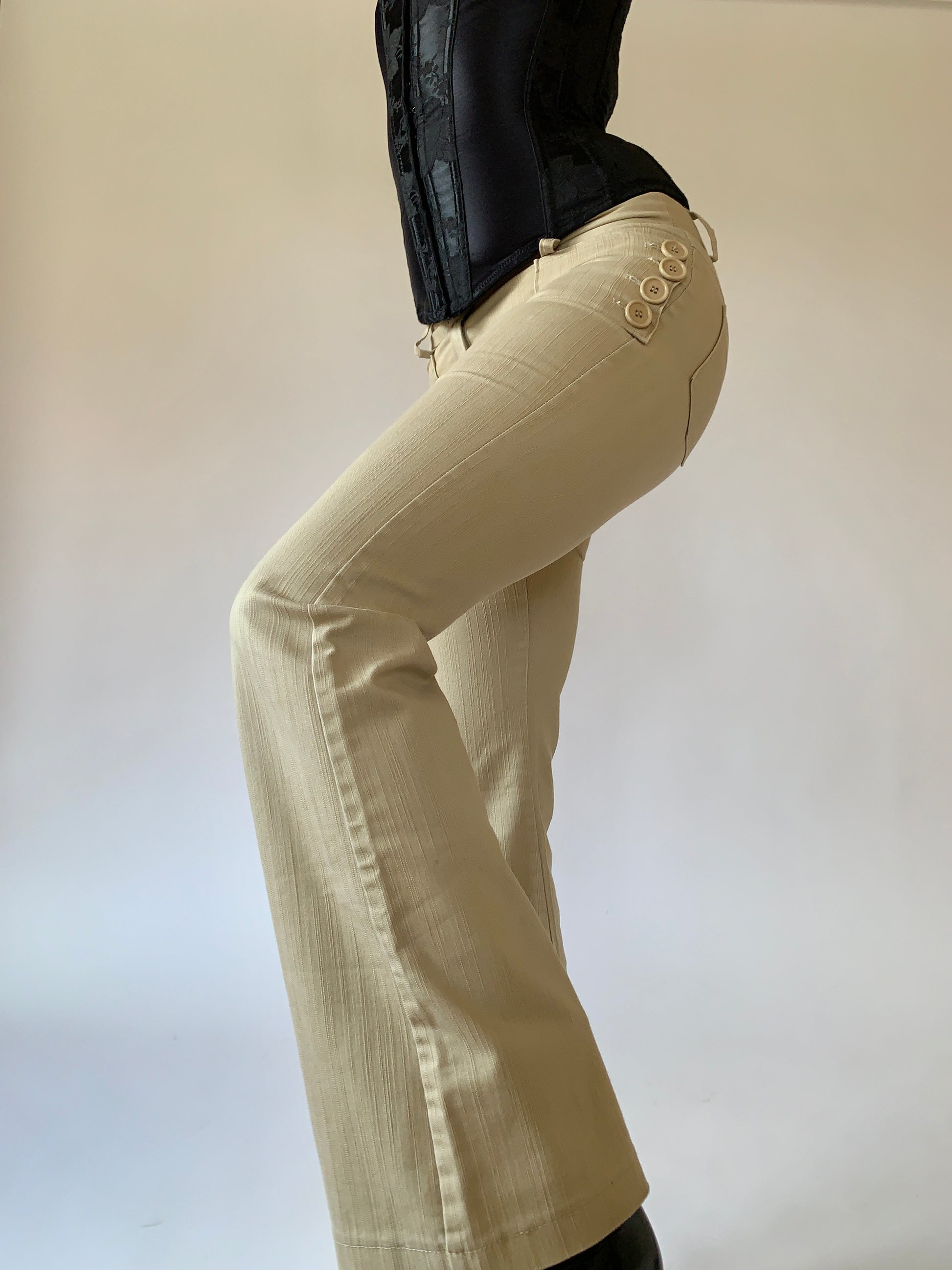 Y2K tan trousers by Copper Key. Low rise with flare. Material is a cotton/poly/spandex blend. Excellent condition despite very small discoloration spot. Tagged size 3.