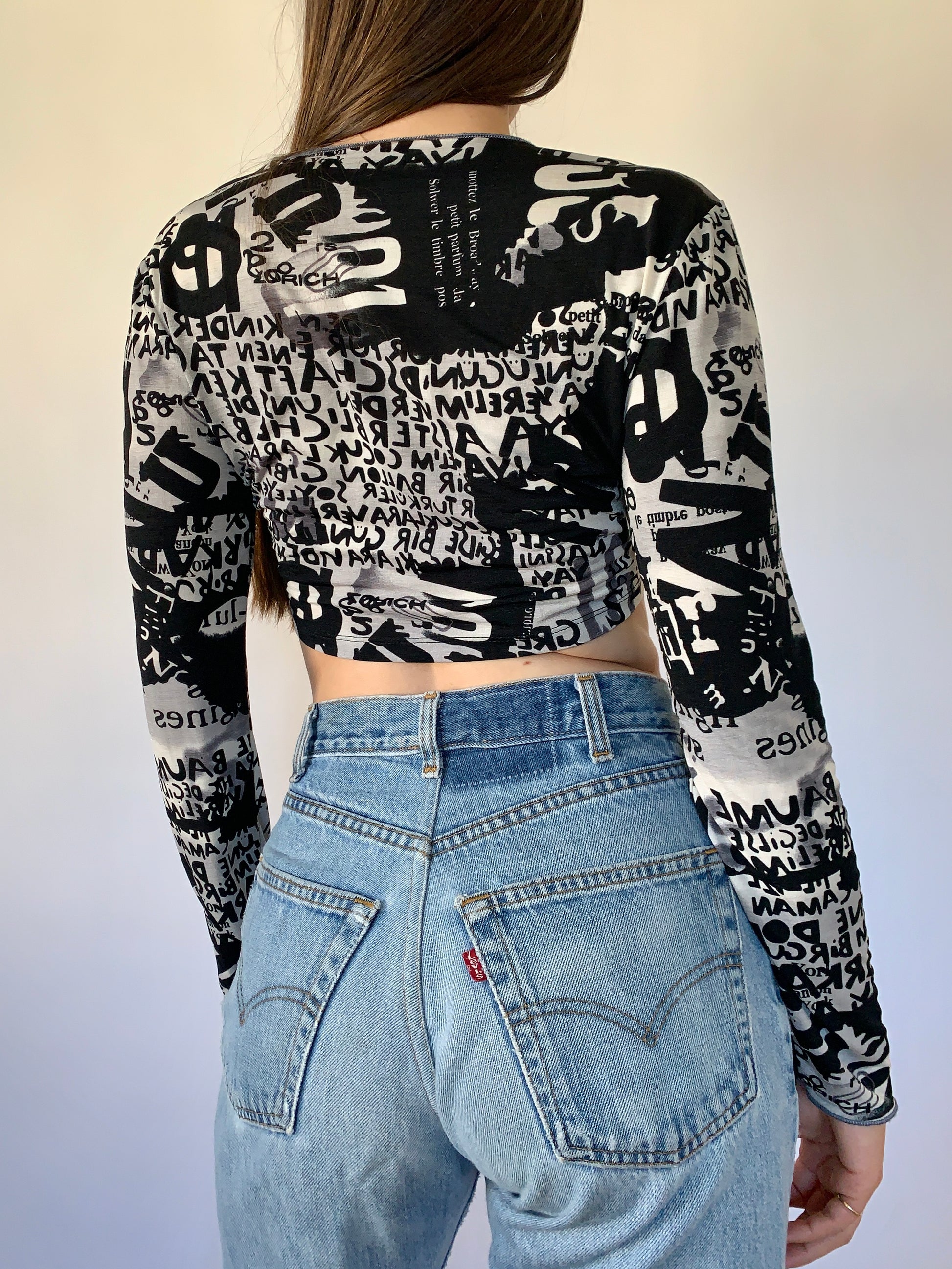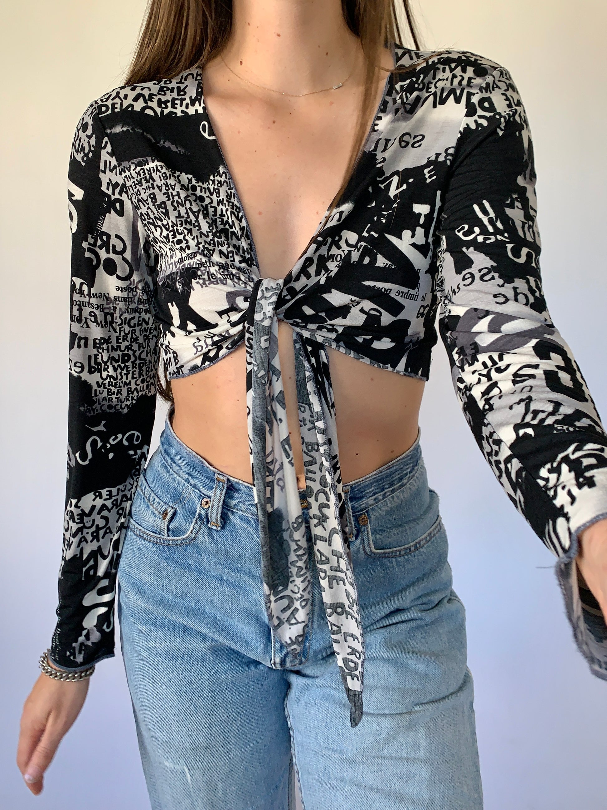 Y2K graphic crop top. Long sleeved with tie closure. In black and white. Excellent condition. Best fits S-M, material has stretch. Shown on size S.